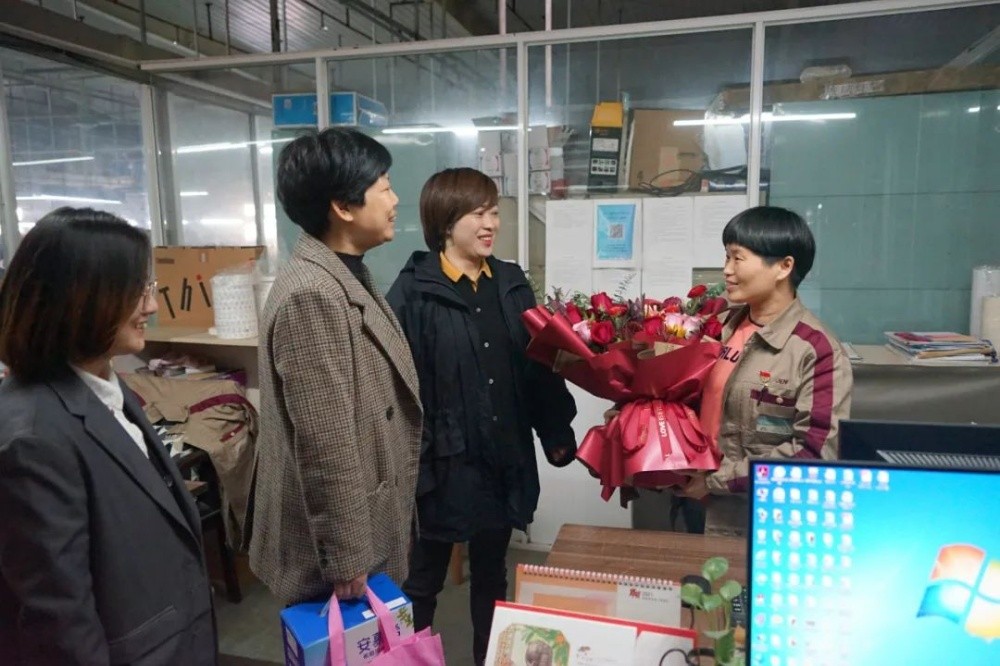 11月11日,斜橋鎮(zhèn)婦聯(lián)主席蔡丹薇等在集團婦聯(lián)主席顧麗萍的陪同下到斜橋廠區(qū)慰問“全國三八紅旗手”、“浙江省勞?!崩蠲魅A,給她送去了鮮花和問候。
