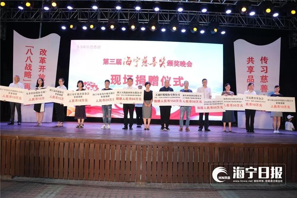 昨天晚上,由海寧市人民政府主辦的第三屆“海寧慈善獎(jiǎng)”頒獎(jiǎng)晚會(huì)在海寧文化館廣場(chǎng)盛大舉行,19個(gè)“捐贈(zèng)企業(yè)獎(jiǎng)”、10名“慈善之星”、10個(gè)“慈善組織獎(jiǎng)”、10個(gè)“慈善項(xiàng)目獎(jiǎng)”受到了表彰。本集團(tuán)獲得了“捐贈(zèng)企業(yè)獎(jiǎng)”榮譽(yù)稱號(hào)。評(píng)選委員會(huì)給予“捐贈(zèng)企業(yè)獎(jiǎng)”的頒獎(jiǎng)詞是:“如果說(shuō)企業(yè)家身上要流淌著道德的血液,那么,企業(yè)就是社會(huì)責(zé)任的承擔(dān)者和社會(huì)良心的守望者。在海寧,有一大批企業(yè),如萬(wàn)川歸海,用創(chuàng)新涌起經(jīng)濟(jì)的浪潮,用慈善重寫財(cái)富的價(jià)值?!?/span>