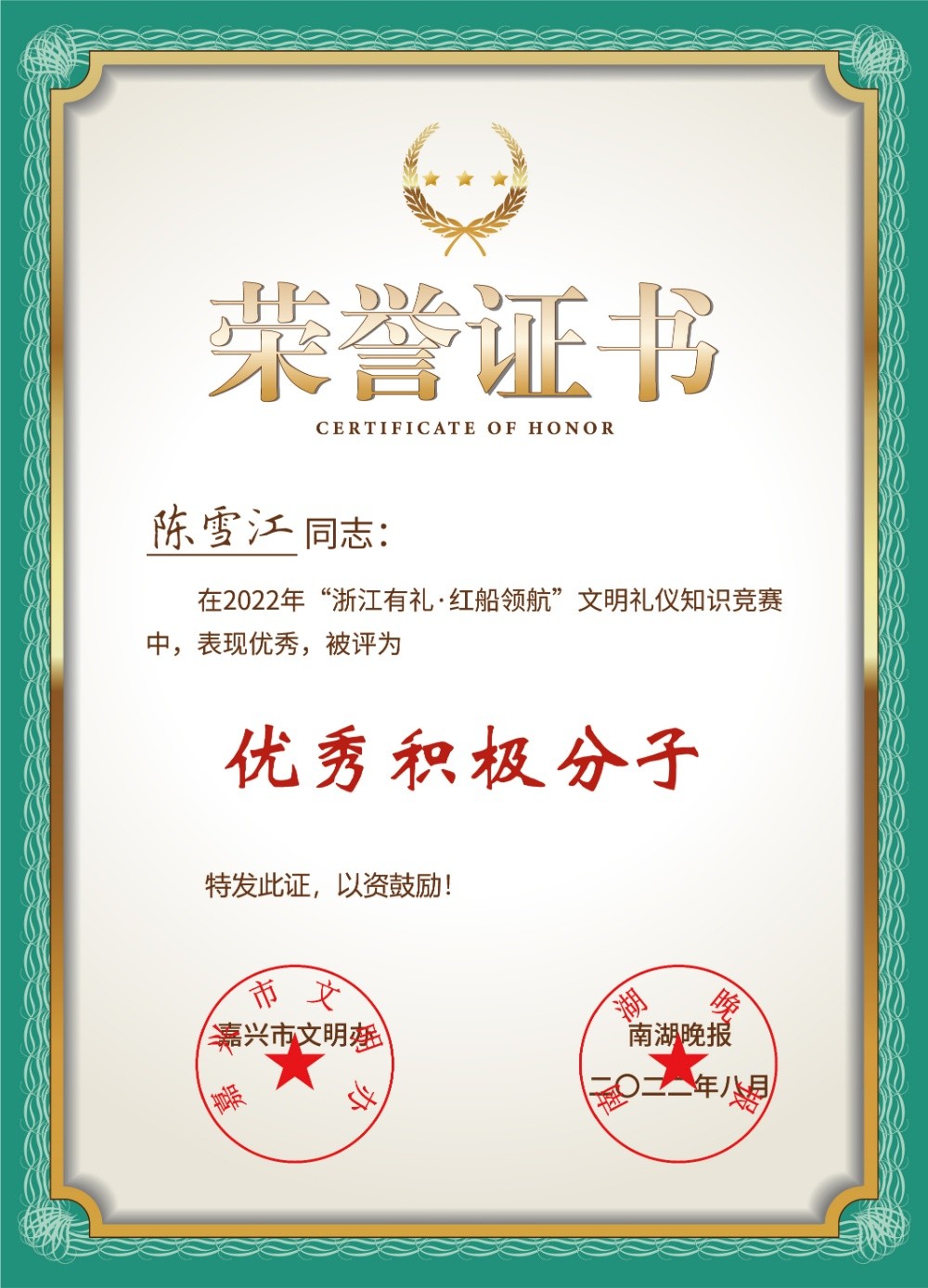 日前,“浙江有禮·紅船領航”文明禮儀知識競賽落下帷幕,海寧市獲得了總戰(zhàn)報參與率第一的好成績!我們卡森集團榮獲優(yōu)秀組織獎,中共黨員徐春江、陳雪江榮獲優(yōu)秀積極分子。