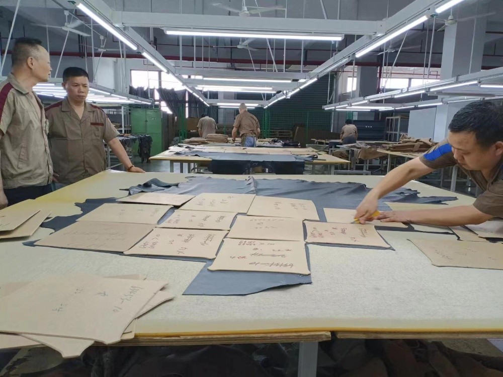 6月13日下午1時裁剪車間也進行了激烈比拼,8名一線員工較量63422-10皮1套的裁剪。比賽中選手把皮平攤在桌子上,認真地把皮疵點圈出,然后把樣板放皮上,嚴格按質量要求認真裁皮。經過激烈角逐,范國峰拿下了第一名。