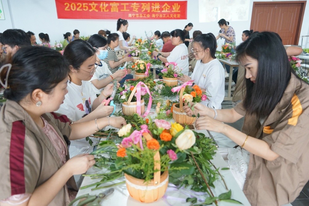 接著是“‘愛在四季?工會(huì)有約’公益培訓(xùn)”——插花活動(dòng),由專業(yè)的插花老師現(xiàn)場(chǎng)授課教學(xué)。老師從插花的基本技巧、花材選取、顏色搭配、審美構(gòu)圖等逐一講授,并同步演示了插花全過程。大家發(fā)揮自己的想象,用心構(gòu)思、精心創(chuàng)作,在一修一剪之間,一件件細(xì)致精美、別出心裁的插花作品逐漸呈現(xiàn),沁人心脾。聞著花香,交流著心得,看著一束束原本普通、零散的花朵變成了精致的藝術(shù)作品,每個(gè)人的臉上洋溢著滿滿的成就感和幸福感。