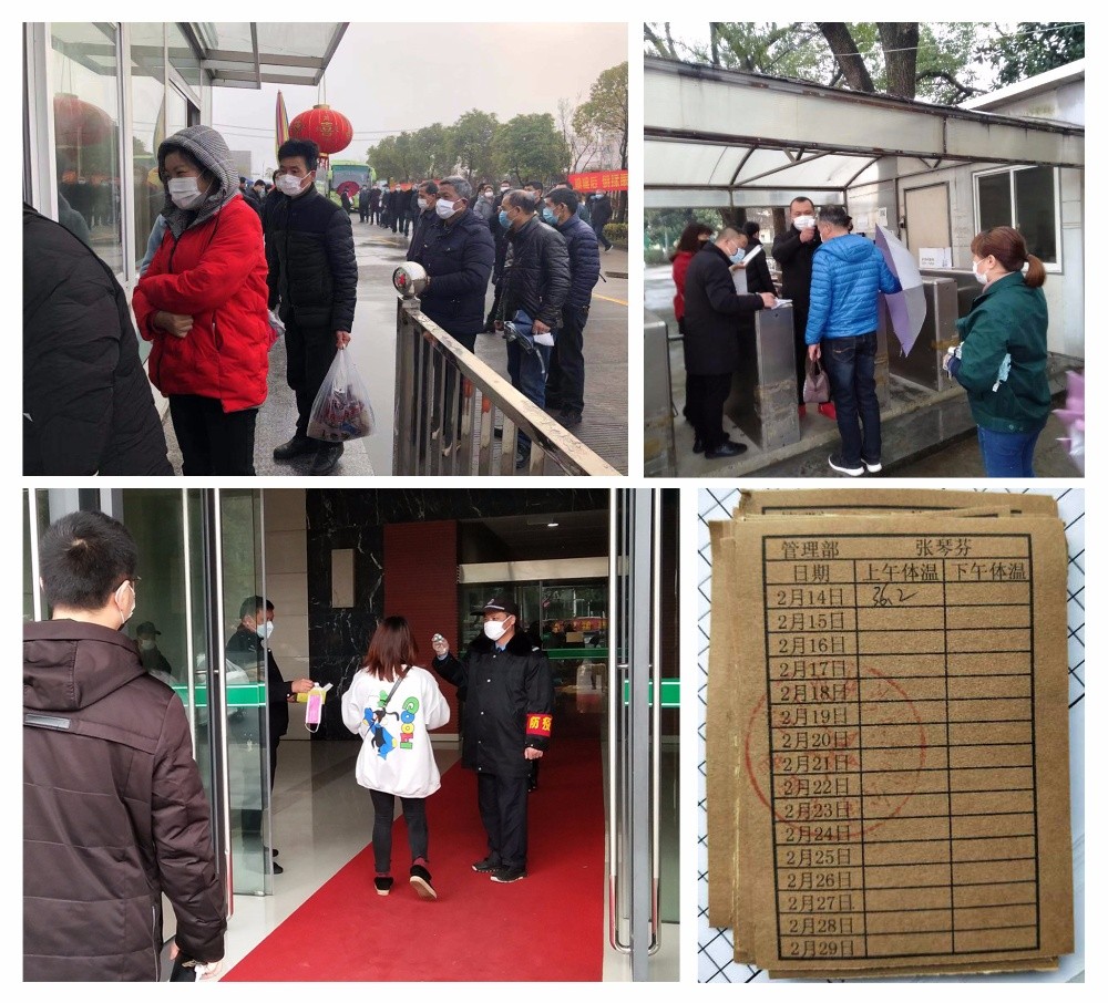 廠門口的員工都戴上口罩,有序排隊,保持1米以上間距,進入公司的每一個都要測量體溫并做好登記,有的子公司還制作了體溫測量小卡片。同時為每位上班員工配發(fā)口罩。