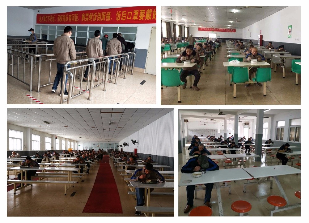 各子公司想方設(shè)法進行就餐管理,有的實行車間分餐制和辦公室就餐制,用一次性餐盒送餐到車間或自帶餐具到辦公室就餐,并統(tǒng)一回收;在食堂就餐的,實行錯時就餐,有序排隊領(lǐng)餐,各自分散吃飯,地上有一米線區(qū)間標(biāo)識,桌上也標(biāo)有座位隔離線,保持一米以上距離,有的一人一桌,禁止互相聊天,提升了文明安全等級。